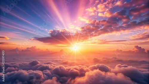 Gentle morning light peeks through a veil of clouds above a serene tuxedo pink sunrise sky with soft gentle hues and warm tones , warm tones, gentle light