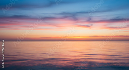 Gentle pink and orange hues reflecting off a calm evening sky over the ocean horizon