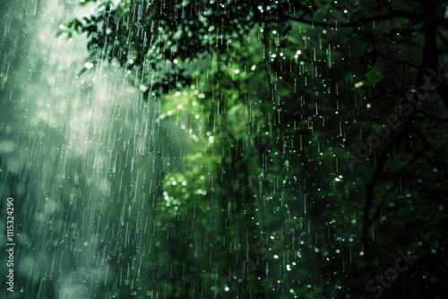 Gentle rain falling through lush green leaves in a dense forest during a tranquil afternoon moment captured in nature