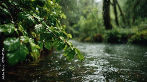 Gentle rain falls in a dense forest, creating ripples in the stream water. Lush green leaves glisten with droplets, enhancing the serene ambiance of this peaceful setting.