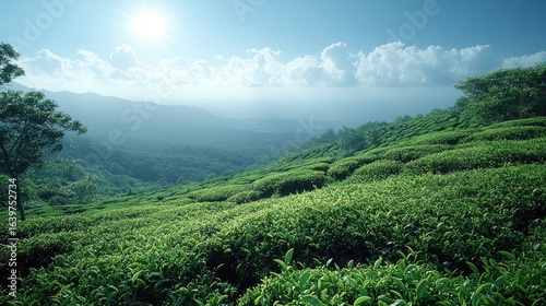 Gentle slopes covered in tea bushes with open sky and sunlight bringing out textures