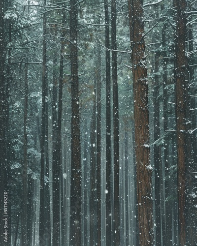gentle snowfall in a dense forest, with snowflakes softly falling through tall pine trees