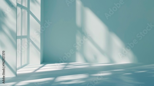 Gentle sunlight casts intricate shadows through large windows into an empty, serene room, creating a peaceful and minimalist ambiance.