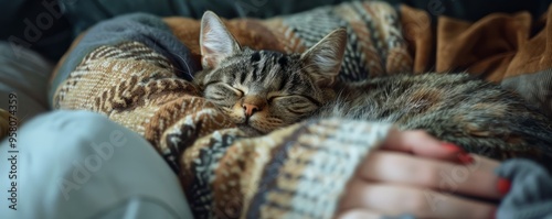 Gentle tabby cat cuddling with owner on sofa, 4K hyperrealistic photo