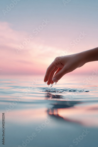 Gentle touch. Serene image featuring a hand dipping into calm waters reflecting a pastel sunset sky. Evokes tranquility, purity, and connection. Ideal for wellness, beauty, or travel.