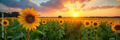 Gentle warm colors of sunset on a vast green meadow, sunflower, sunset, fields