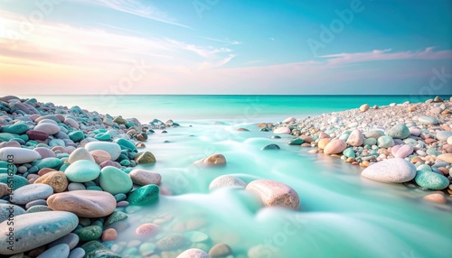 Gentle waves caressing colorful stones serene beach nature photography coastal environment wide-angle view tranquility concept