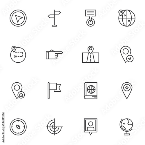 Geo location line icons set, gps navigation outline vector symbol collection, linear style pictogram pack. Signs logo illustration. Set includes icons as signpost, map marker, route distance direction