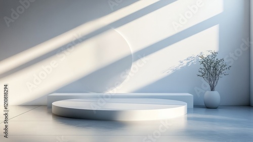 Geometric 3D round podium set in white, with ambient light and shadow creating a modern, minimalist display showroom