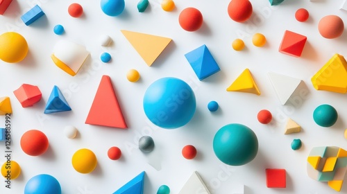 Geometric Abstract: A vibrant and playful composition of colorful spheres, pyramids, and triangles scattered across a clean surface, creating a visually engaging abstract design.