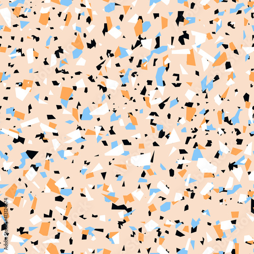 Geometric beige terrazzo seamless pattern. Abstract colourful modern background. Stone fashion design for web and print. Venetian tile, flooring home decor. Chaotic pastel texture.