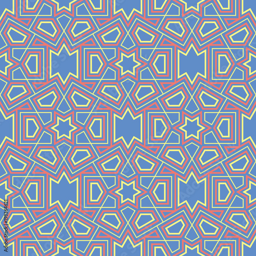 Geometric blue seamless pattern. Multi colored background with red and yellow design