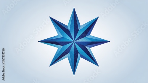 Geometric blue starburst shape with sharp points and shaded facets on a light background