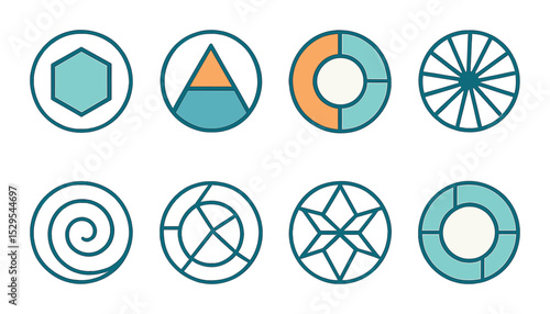 Geometric Circle Logos Concept isometric set. Hexagon inside circle, triangle-circle fusion, segmented pie ring, radial line circle, spiral within circle.