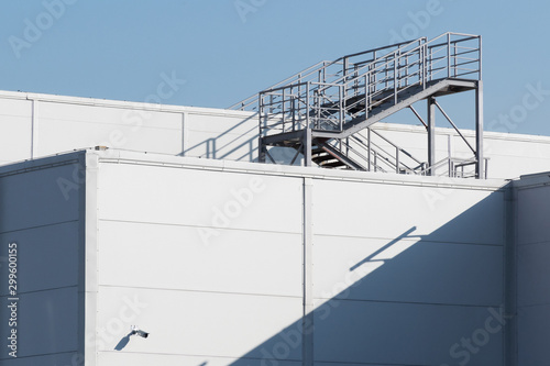 Geometric colored building facade elements with planes, lines and corners with light flare and reflections for an abstract background and texture of white, blue, gray colors. Place for text