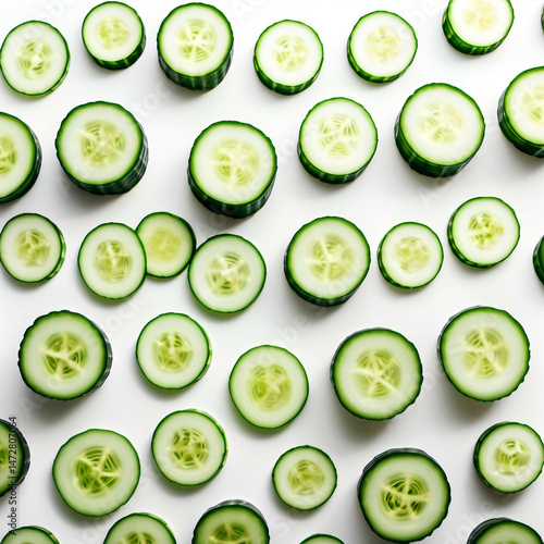 Geometric composition with sliced cucumber arranged in a grid on white background