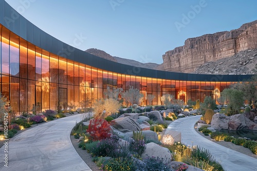 Geometric Desert Oasis: Mirror-Clad Buildings Reflecting Vast Sandscapes