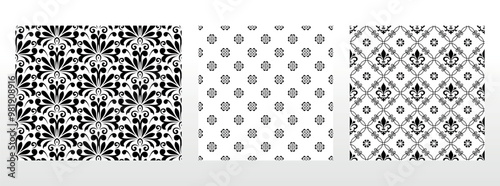 Geometric floral set of seamless patterns. White and black vector backgrounds. Damask graphic ornaments.