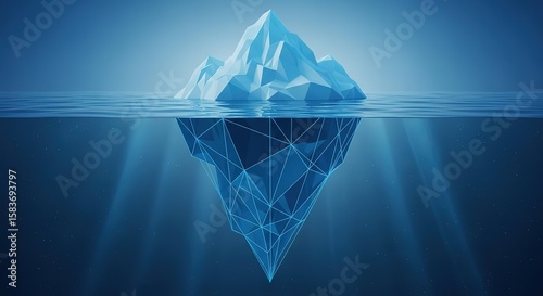 Geometric iceberg with visible submerged structure and light rays in deep blue water