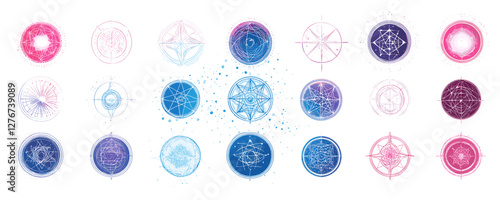 Geometric mandala circles in gradient colors with intricate patterns and cosmic designs. Vector