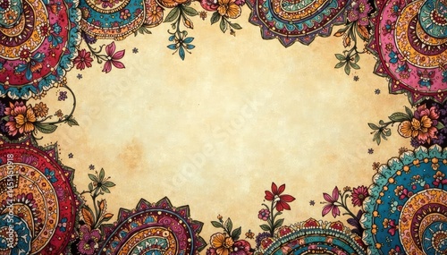 Geometric paisley print on aged paper, sepia tones, shabby, antique, vintage