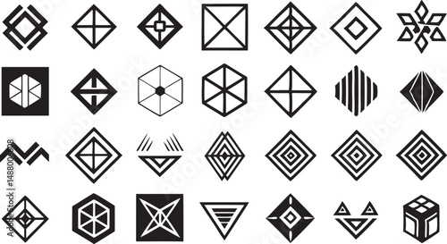 Geometric Patterns and Symbols in Abstract Art and Design on background is white.