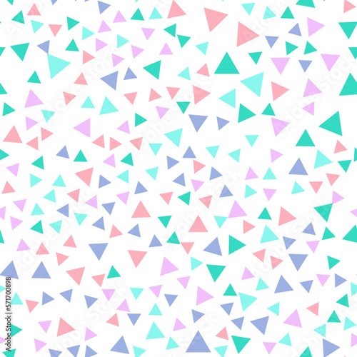 Geometric seamless pattern of small green, turquoise, pink, purple triangles for textile, paper and other surfaces