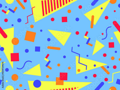 Geometric seamless pattern with memphis elements in 80s style. Colorful geometric pattern. Design of promotional products, wrapping paper and printing. Vector illustration