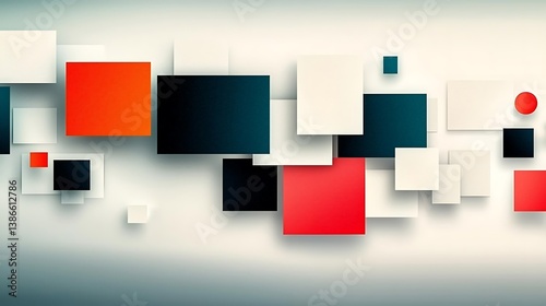 Geometric shapes create a clean, modern pattern with shades of white, red, and dark blue