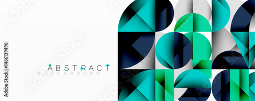 Geometric shapes create vibrant, modern design. Teal, navy, gray tones blend seamlessly. Minimalist aesthetic suits digital projects.