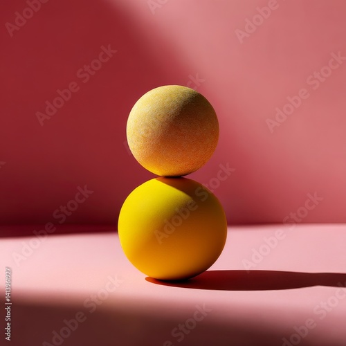 Geometric shapes in equilibrium on yellow sphere over pink background