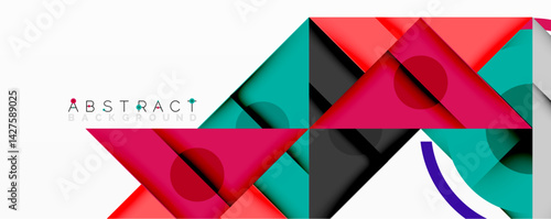 Geometric shapes overlap, creating vibrant composition. Red, teal, pink, black colors dominate design. Modern aesthetic, clean lines present abstract background.