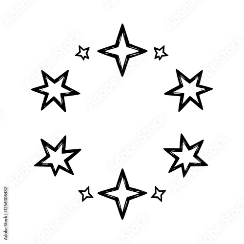 Geometric Sketch: A Ring of Stars in a White Backdrop with Varying Sizes
