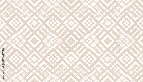Geometric, symmetrical pattern featuring interlocking, angular shapes in a warm beige and white palette. The design suggests a textured effect