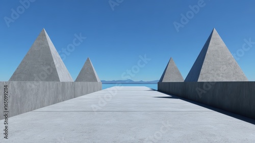 Geometric symmetrical pyramid structures with perspective depth, minimalist concrete architecture under blue sky and clouds.