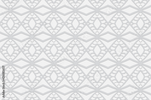 Geometric volumetric convex white background.Ethnic African, Mexican, Indian motives.Doodling style. 3D embossed decorative pattern.