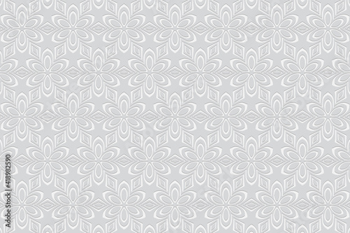 Geometric white ethnic floral stylized wallpaper. A background with a volumetric composition with a 3D effect of a convex shape.