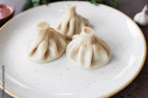 Georgian Khinkali on a white plate. Closeup. view from above. National cuisine