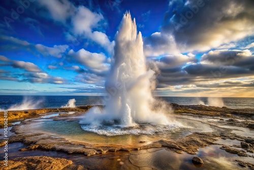 Geothermal geyser erupting into ocean near rocky shore stunning landscape
