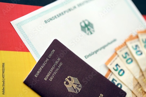 German passport on an official naturalization certificate. Symbolic for successful acquisition of German citizenship close up