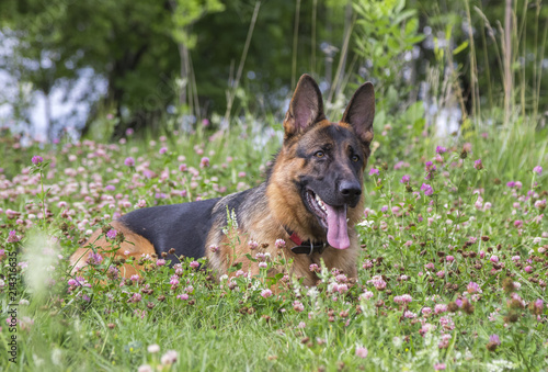 German shepherd play in the summer park