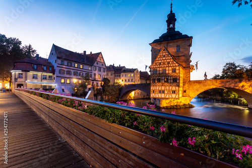 Germany, Bavaria, Bamberg, Old town hall, Obere Bruecke and Regnitz river at dusk