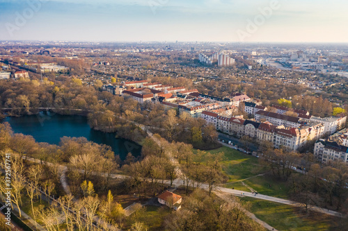 Germany, Berlin, Aerial view of pond at edge of Treptower Park in autumn