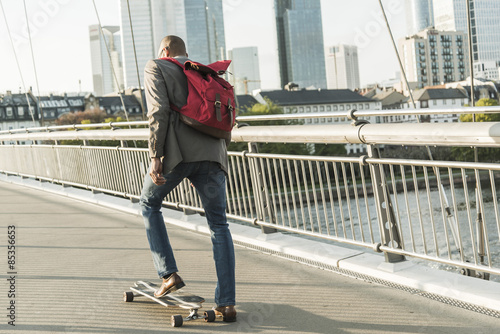 Germany, Frankfurt, man skateboarding on bridge