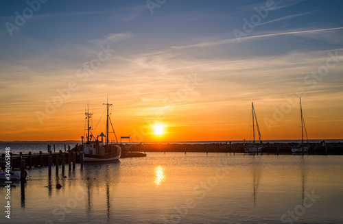 Germany, Mecklenburg-West Pomerania, Poel Island, Timmendorf, Sailboats and pier at sunset