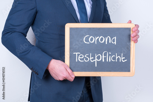 Geschäftsführer oder Manager mit einer Tafel auf der Corona Testpflicht steht