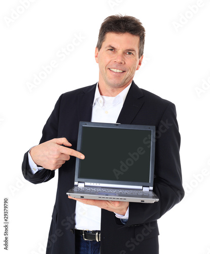 Geschäftsmann zeigt auf den Bildschirm eines Computers.