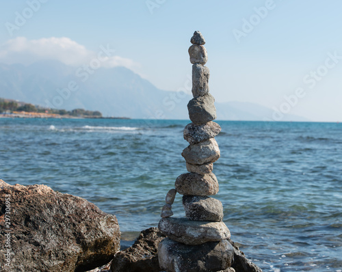 Gestapelte Steine zum Turm erbaut am Strand von Kos Griechenland