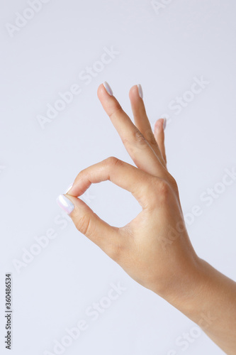 Gesture and sign, female hand on a white background. Fingers showing ok or good