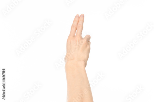 Gestures topic: human hand gestures showing first-person view isolated on white background in studio